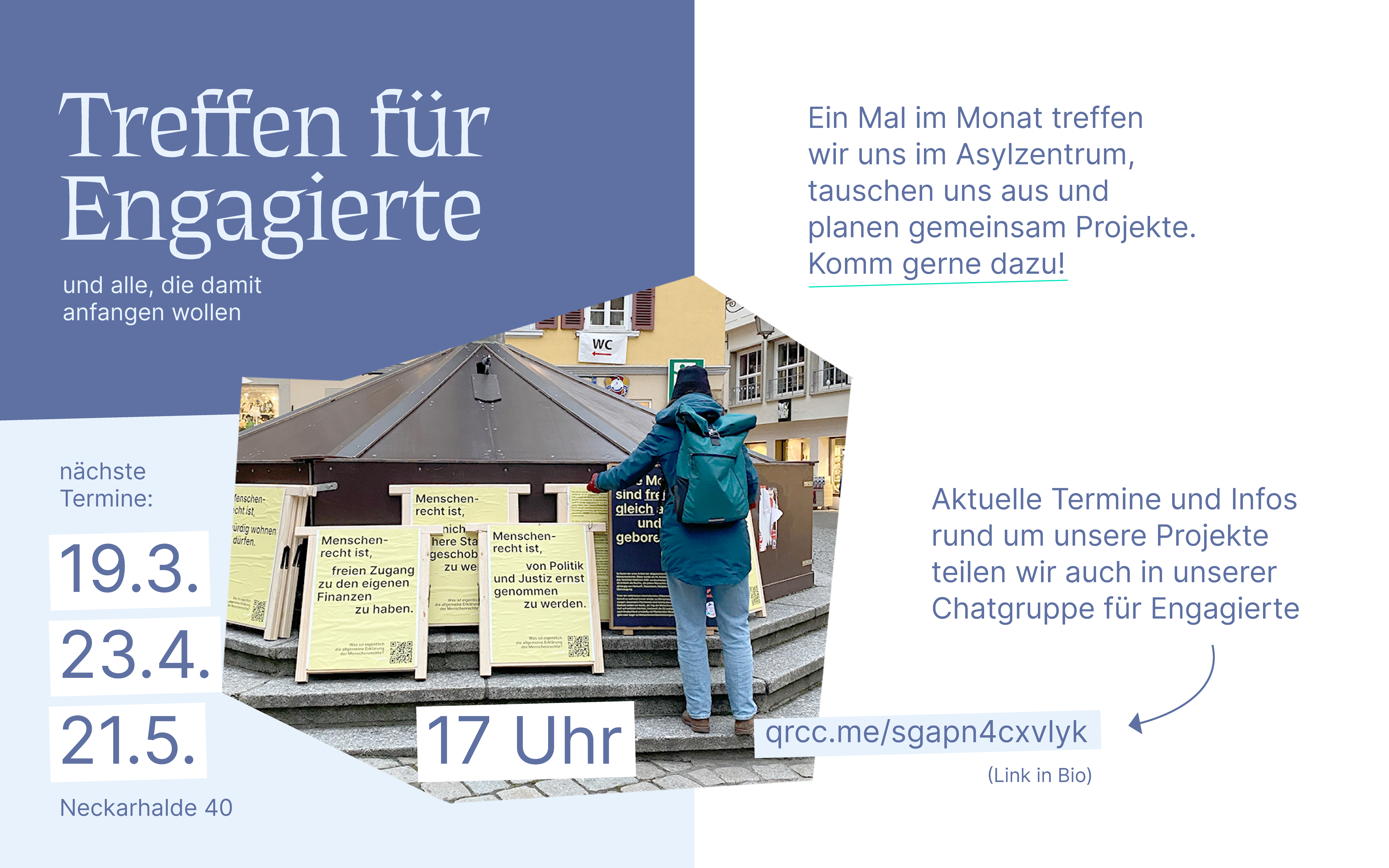 Aktu­el­le Ter­mi­ne und Infos rund um unse­re Pro­jek­te tei­len wir auch in unse­rer Chat­grup­pe für Enga­gier­te: